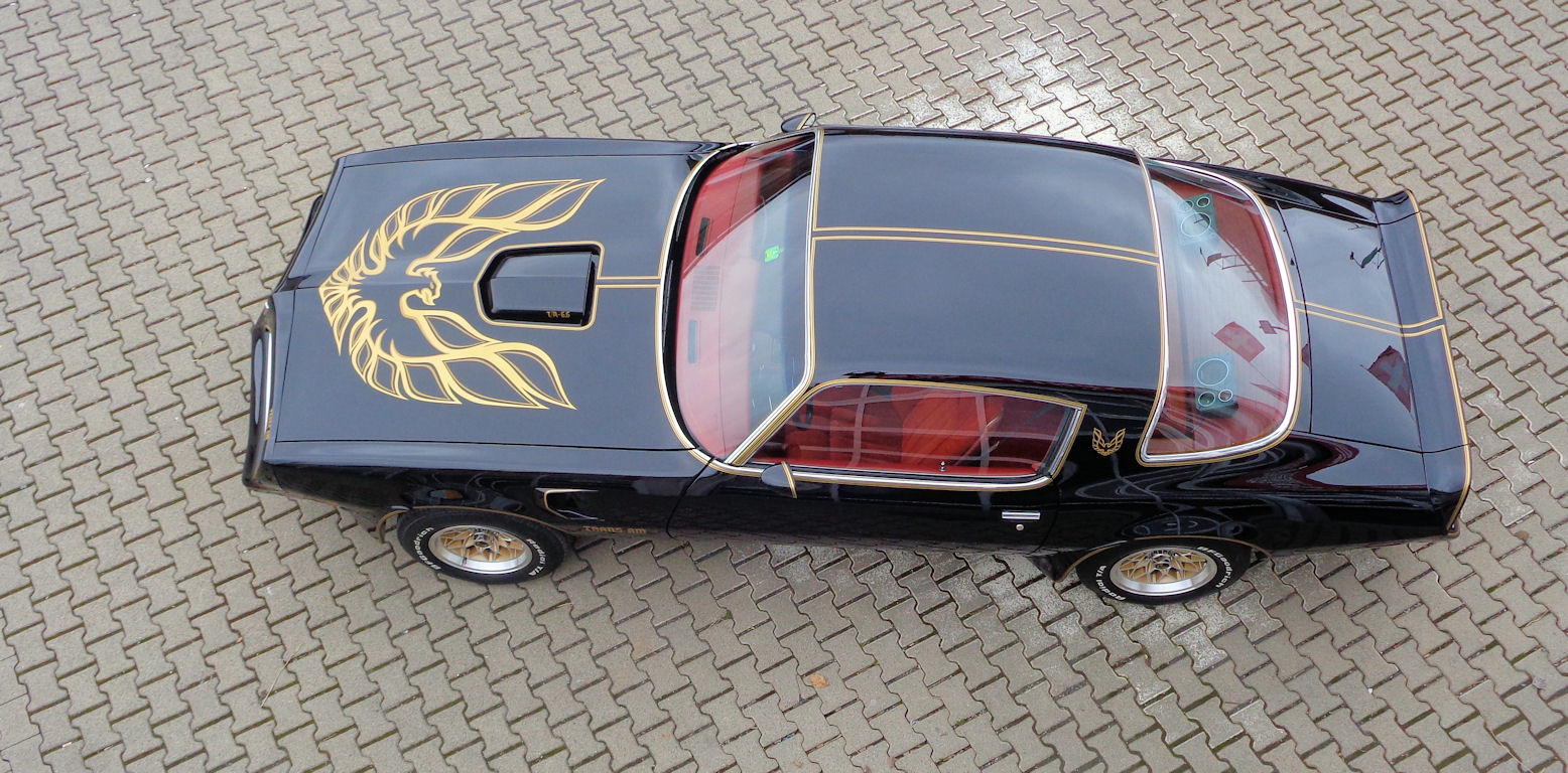 Originalschriftzüge in Gold Tönen in fantastischem Kontrast zur Aussenlackierung in schwarz und dazu passender originaler Motorhauben-Adler, originale goldene Pontiac Snowflake-Sportfelgen.
